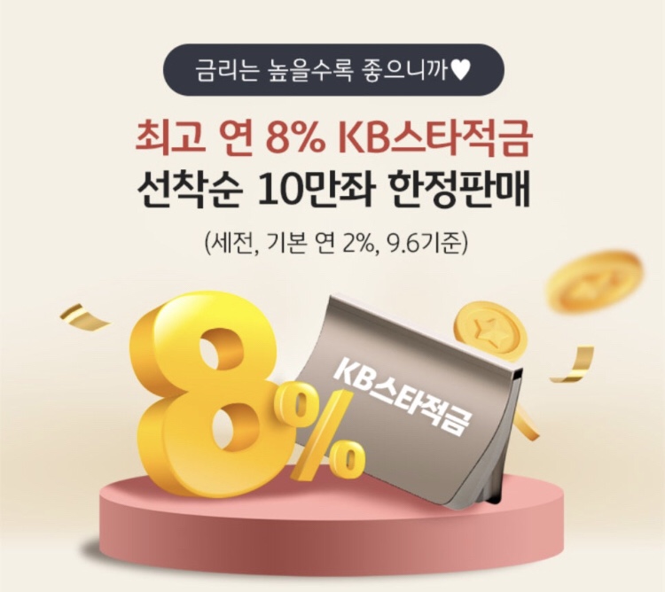KB스타적금은 최대 연 8.0%의 높은 금리와 유연한 자금 관리를 가능하게 하는 적금 상품입니다. 이 상품은 10만 계좌 한정으로 제공되며, 선착순으로 가입할 수 있어 기회가 제한적입니다. 이 적금은 스마트한 금융습관을 시작하고 종잣돈을 모으기에 최적의 선택이 될 수 있습니다. 기회가 짧으므로 지금 바로 KB스타뱅킹 앱을 통해 가입하여 혜택을 누리시길 권장드립니다.