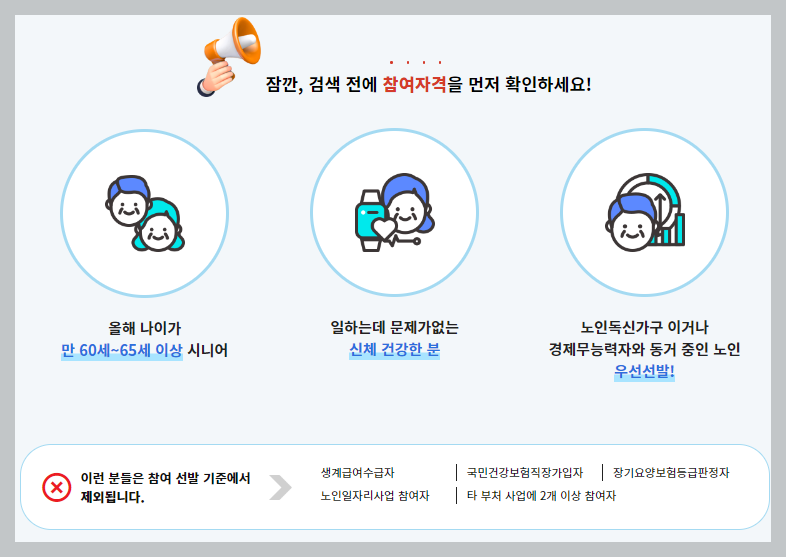 1. 자격확인 : 만 60세 이상, 건강상태 양호, 기초연금 수급자 우선