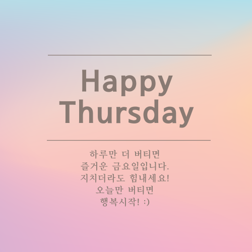 그래서 목요일은 긍정적인 마음과 좋은 생각이 더욱 필요한 요일이라는 생각이 드는데요~ 주변의 소중한 지인, 가족, 친구, 직장 동료들에게 귀엽고 예쁜 인사말 이미지를 보내보는 것은 어떨까요? 즐겁고 행복한 목요일 되시고, 다가오는 주말에도 기쁨 가득한 날들 되시기를 바랍니다.