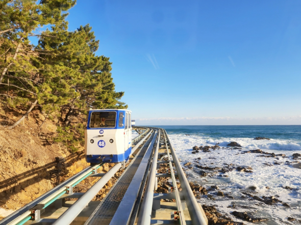 죽변 해안 스카이레일은 울진바다를 따라 움직이는 모노레일입니다. 하트해변, 드라마 폭풍 속으로 세트장, 죽변등대를 볼 수 있습니다.