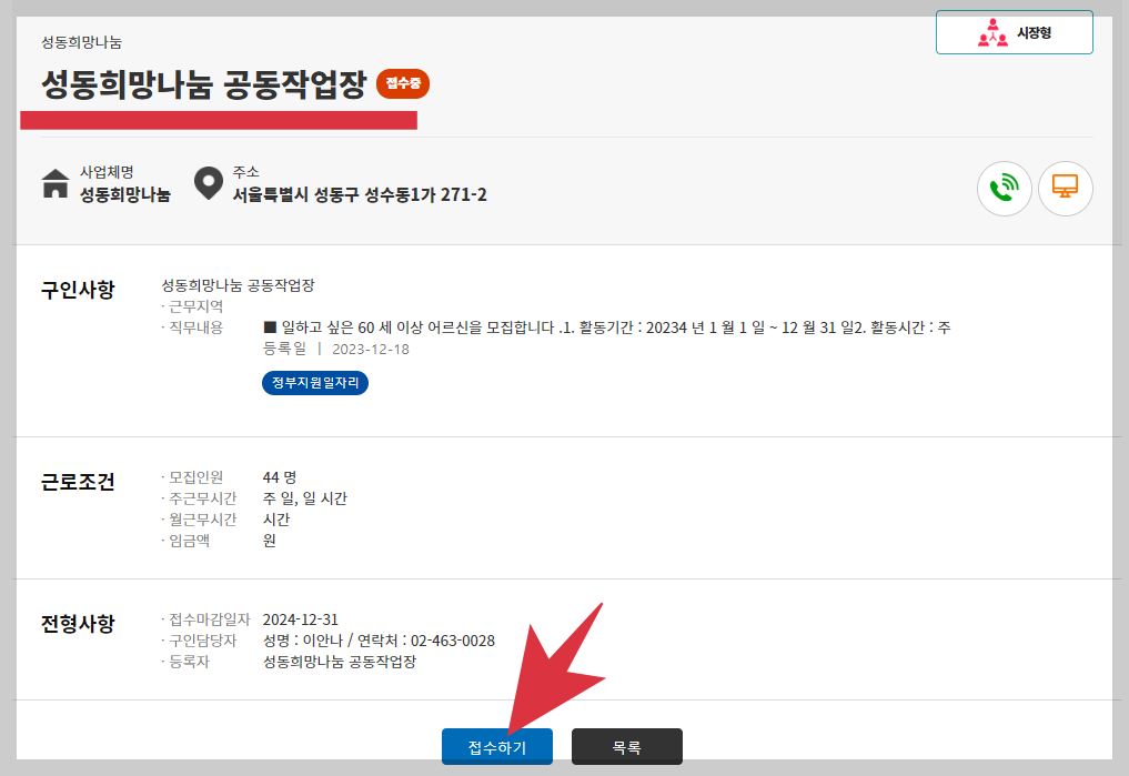 3. 접수하기 클릭 : 선택한 사업의 모집공고를 확인한 후, 하단에 위치한 (접수하기) 버튼을 클릭합니다.