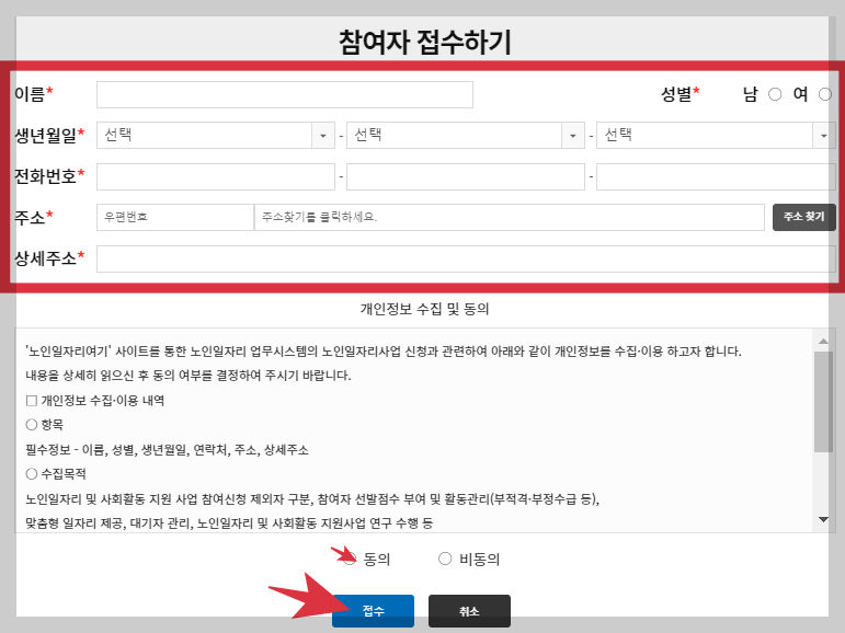 4. 신상정보 및 입력 및 동의 : 접수하기 버튼을 선택하면 개인정보 입력란이 표시됩니다. 이름, 성별, 생년월일, 전화번호 등을 입력한 후 개인정보 수집에 동의하는 란에 체크합니다.