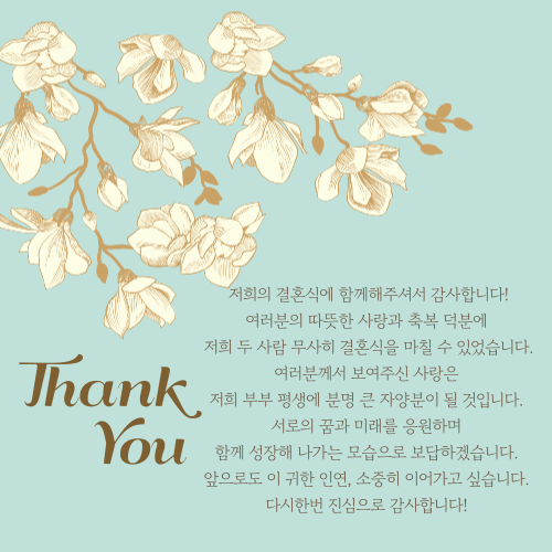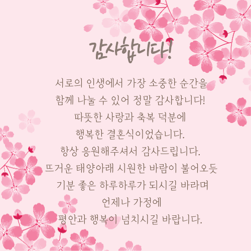 6. 감사합니다! 서로의 인생에서 가장 소중한 순간을 함께 나눌 수 있어 정말 감사합니다! 따뜻한 사랑과 축복 덕분에 행복한 결혼식이었습니다. 항상 응원햊셔서 감사드립니다. 뜨거운 태양아래 시원한 바람이 불어오듯 기분 좋은 하루하루가 되시길 바라며 언제나 가정에 평안과 행복이 넘치시길 바랍니다.