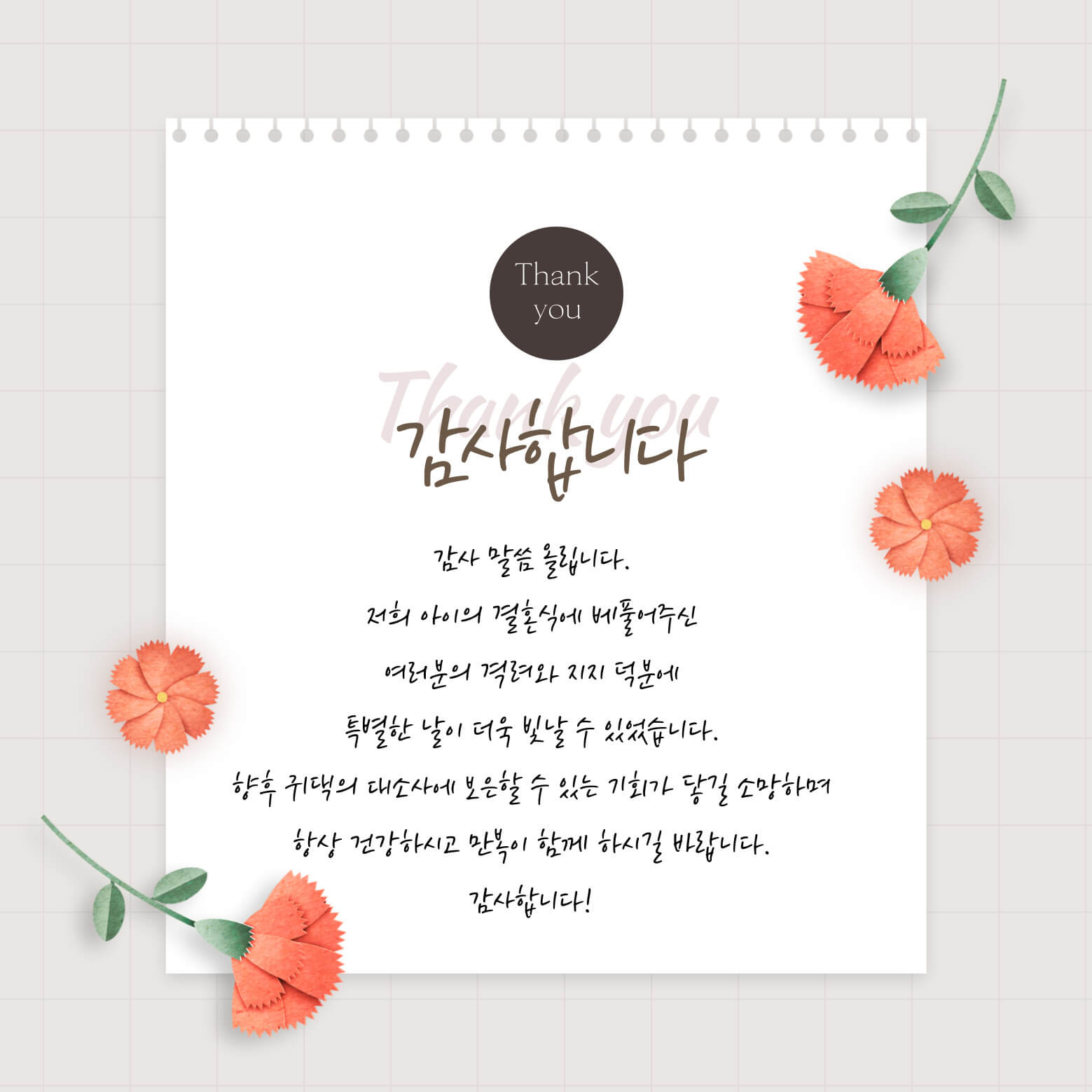 2. 감사말씀 올립니다. 금번 저희 집 혼사에 귀한 걸음 하시어 자리를 빛내주시고 축복해 주심에 깊은 감사의 말씀 올립니다. 한분씩 찾아뵙고 인사드리는 게 도리인줄 아오나 부득이 지면으로 먼저 인사를 대신하는 점 너그러이 양해 부탁드립니다. 앞으로 댁내 대소사에도 꼭 연락 주시어 이 감사를 전할 수 있는 기회를 허락해 주시면 감사하겠습니다. 항상 건강하시고 두루 평안하시길 바랍니다.