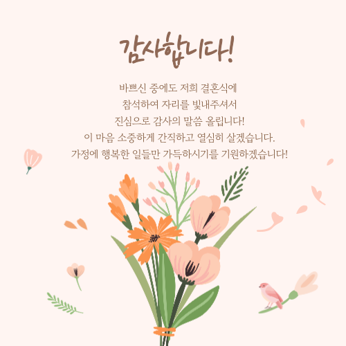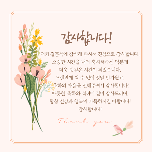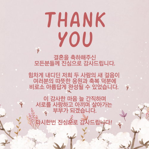 아래 답례 문자 예시와 이미지를 참고하셔서 결혼식 자리를 빛내주셨던 하객분들께 감사의 마음을 꼭 전달하시길 바랍니다!