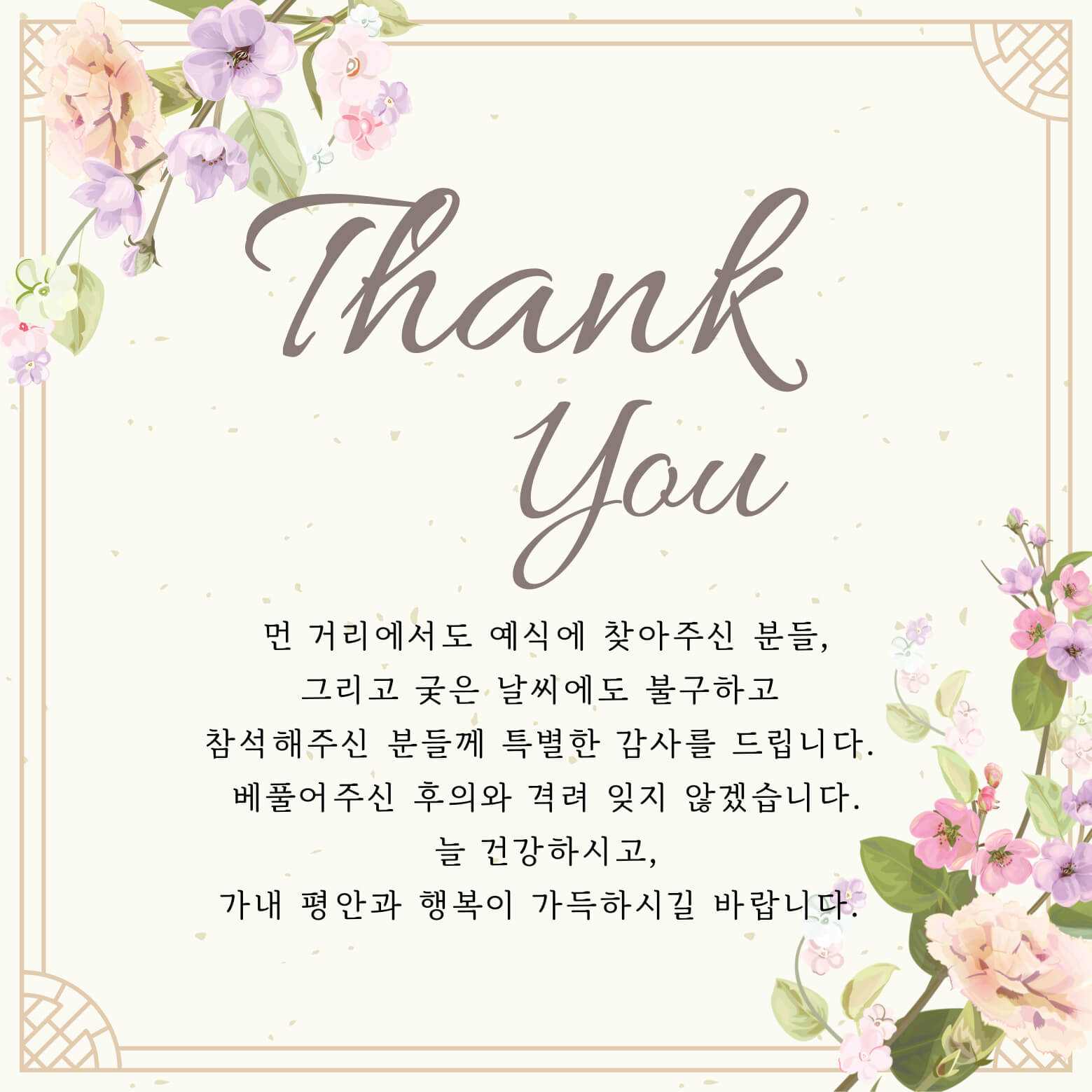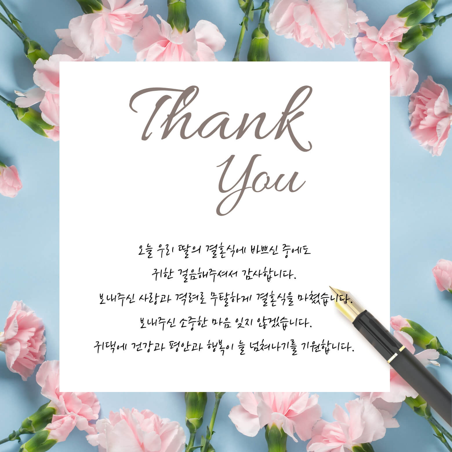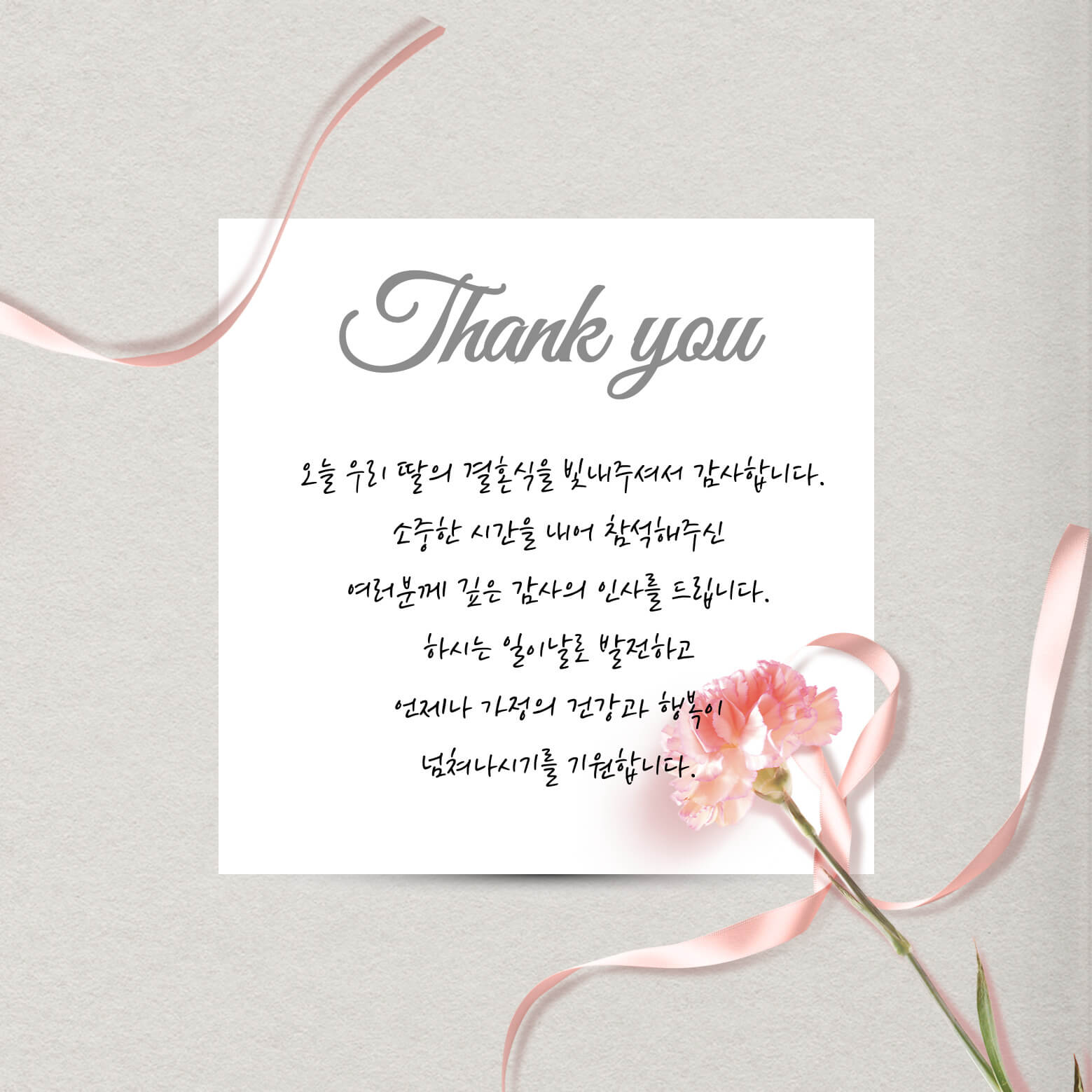 17. 감사말씀 올립니다. 저희 가정의 혼사에 귀한 걸음 하시어 자리를 빛내주시고 축복해 주심에 깊은 감사의 말씀 올립니다. 한분씩 찾아뵙고 인사드리는 게 도리인 줄 아오나 부득이 지면으로 먼저 인사를 대신하는 점 너그러이 양해 부탁드립니다. 앞으로 댁내 대소사에도 꼭 연락 주시어 이 감사를 전할 수 있는 기회를 허락해 주시면 감사하겠습니다. 항상 건강하시고 두로 평안하시길 바랍니다. 감사합니다!