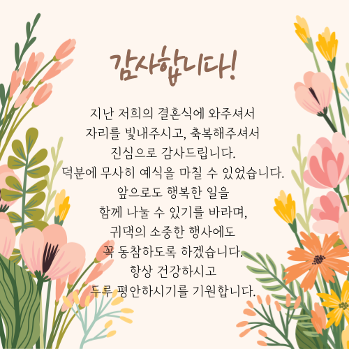 특히, 제일 가까운 친척, 지인들은 반드시 결혼식 답례글이나 답례문자로 감사를 표현하는 것이 정말 중요합니다. 왜냐하면 이러한 답례글이나 답례문자를 통해 진심이 더 잘 전해질 수 있기 떄문입니다.