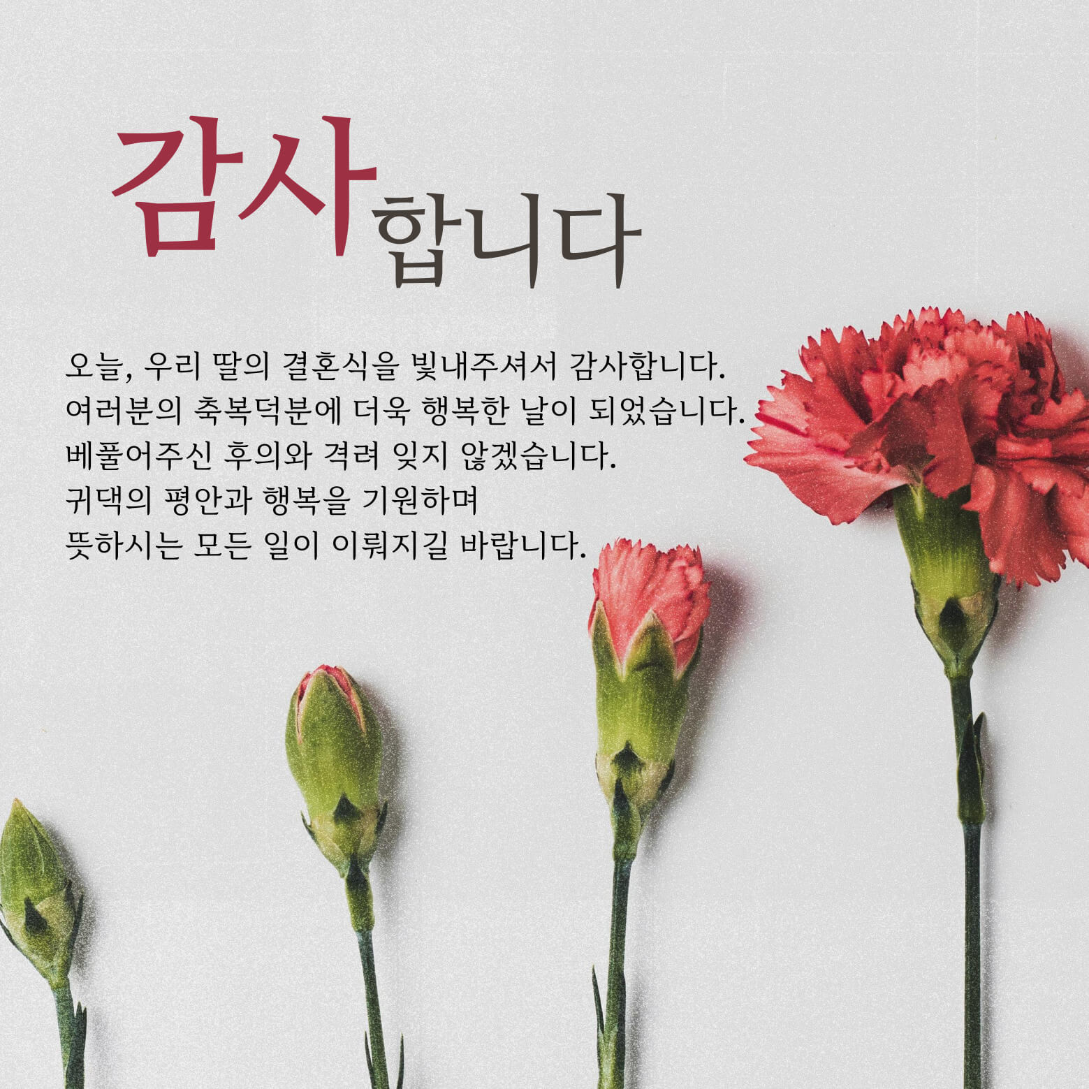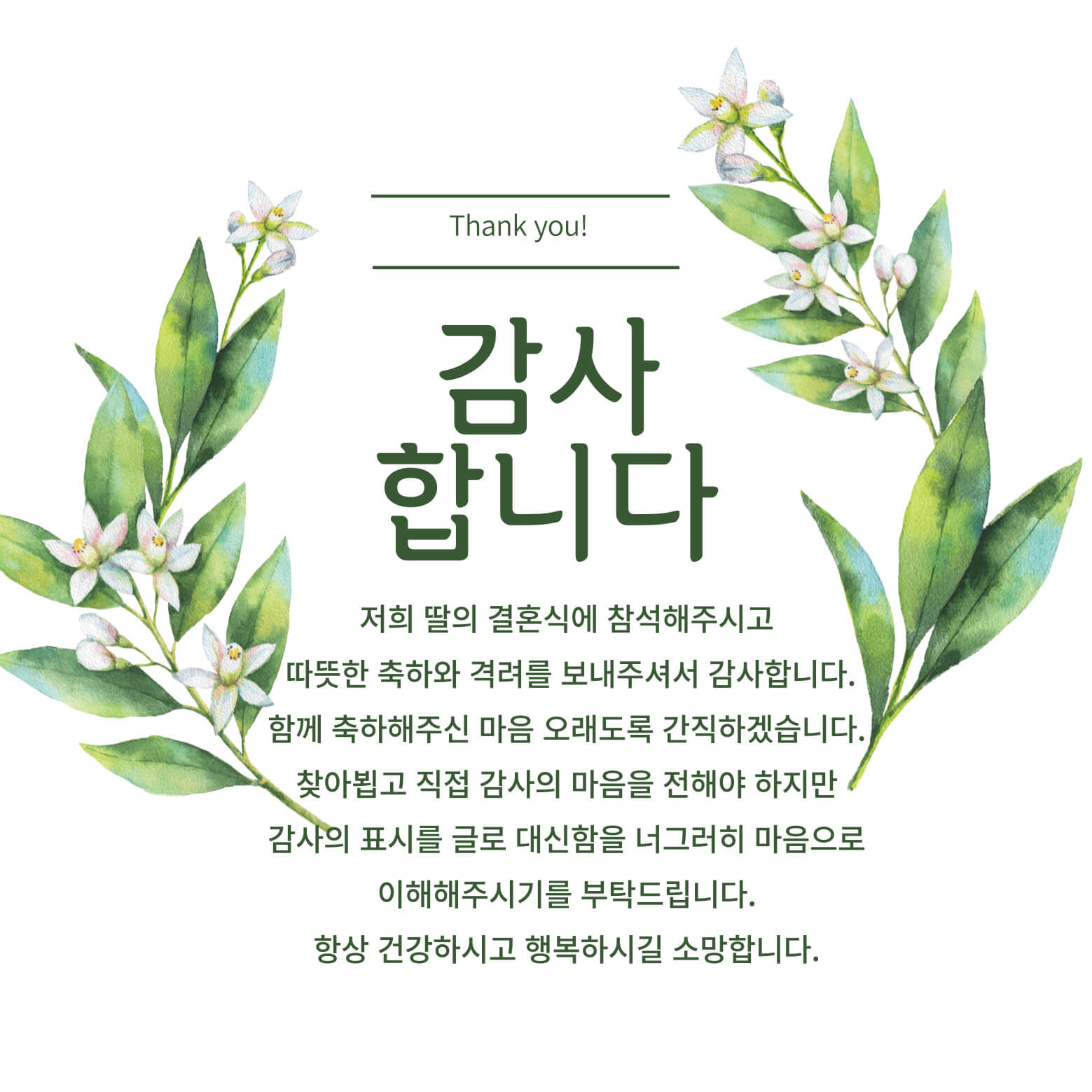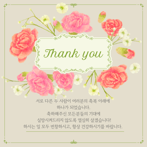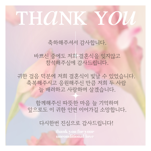 2. 축하해 주신 모든 분들께 진심으로 감사드립니다. 따뜻하고 포근한 사랑덕분에 저희의 결혼식이 특별하고 소중한 순간이 될 수 있었습니다. 새로운 시작을 앞둔 저희에게 베풀어주신 귀한 응원과 사랑은 평생토록 간직할 큰 격려와 힘이 될 것입니다. 늘 건강하시고 원하시는 모든일 형통하시길 바랍니다. 다시한번 진심으로 감사드립니다!