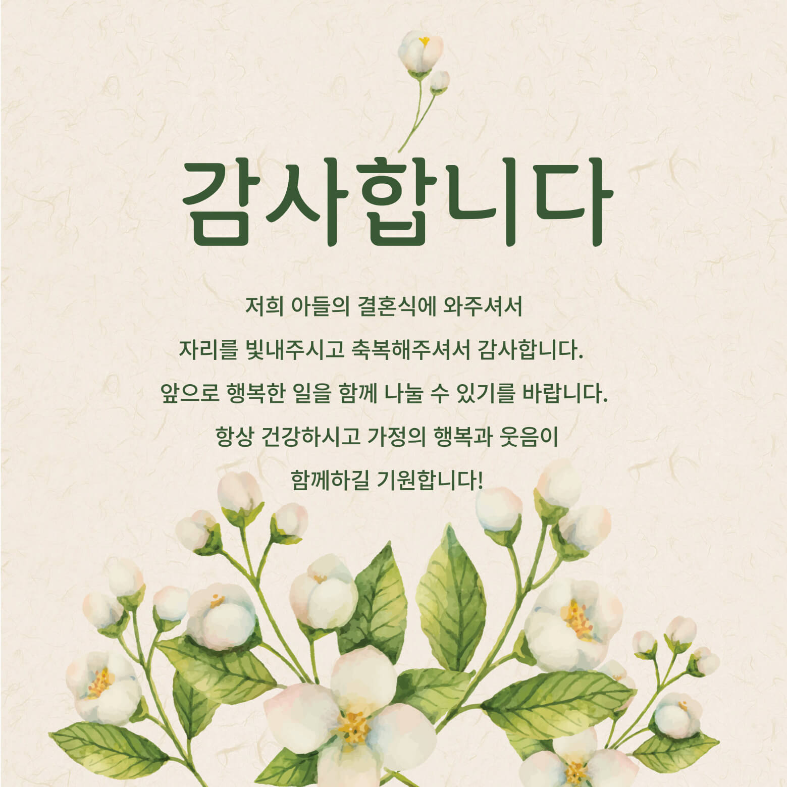 15. 저희 아들의 결혼식에 와주셔서 자리를 빛내주시고 축복해주셔서 감사합니다. 앞으로 행복한 일을 함께 나눌 수 있기를 바랍니다. 항상 건강하식 가정의 행복과 웃음이 함께하길 기원합니다!