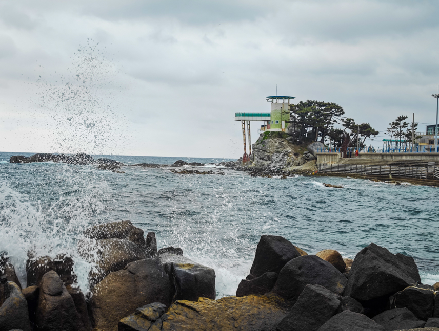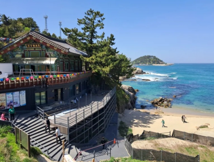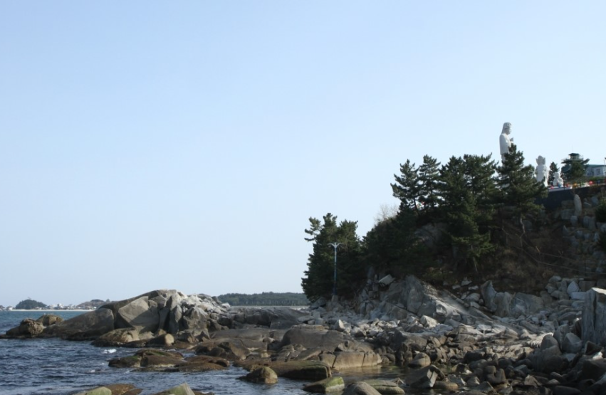 또 다른 주목할만한 명소는 해변에 서 있는 지혜관음보살상입니다. 동해용왕, 남순동자상과 함께 푸른 동해바다가 한눈에 내려다보이는 이 동상은 방문객들에게 인기 있는 명소입니다.
